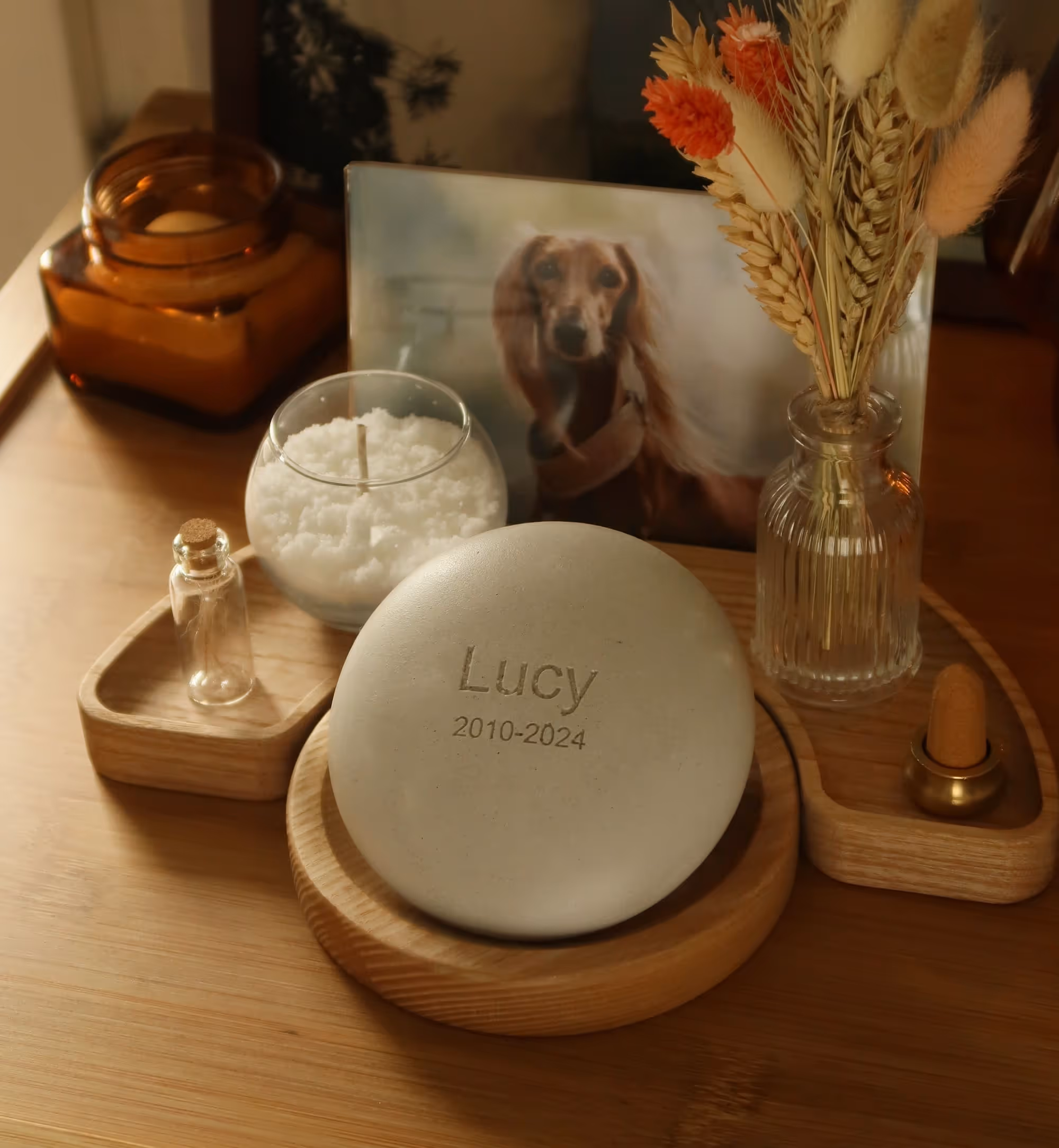 Transforma las cenizas de tu mascota en una única piedra sólida — un recuerdo duradero que permanece cerca, visible y protegido. Para siempre.